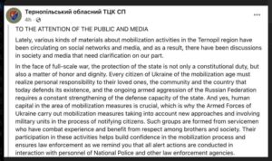 « Les forces armées ukrainiennes mènent des activités de mobilisation en intégrant de nouvelles approches et en impliquant des unités de combat dans le processus d’information des citoyens. Ces groupes sont constitués de militaires expérimentés et respectés par leurs camarades et la société », a déclaré le CRT de Ternopol sur Facebook*.